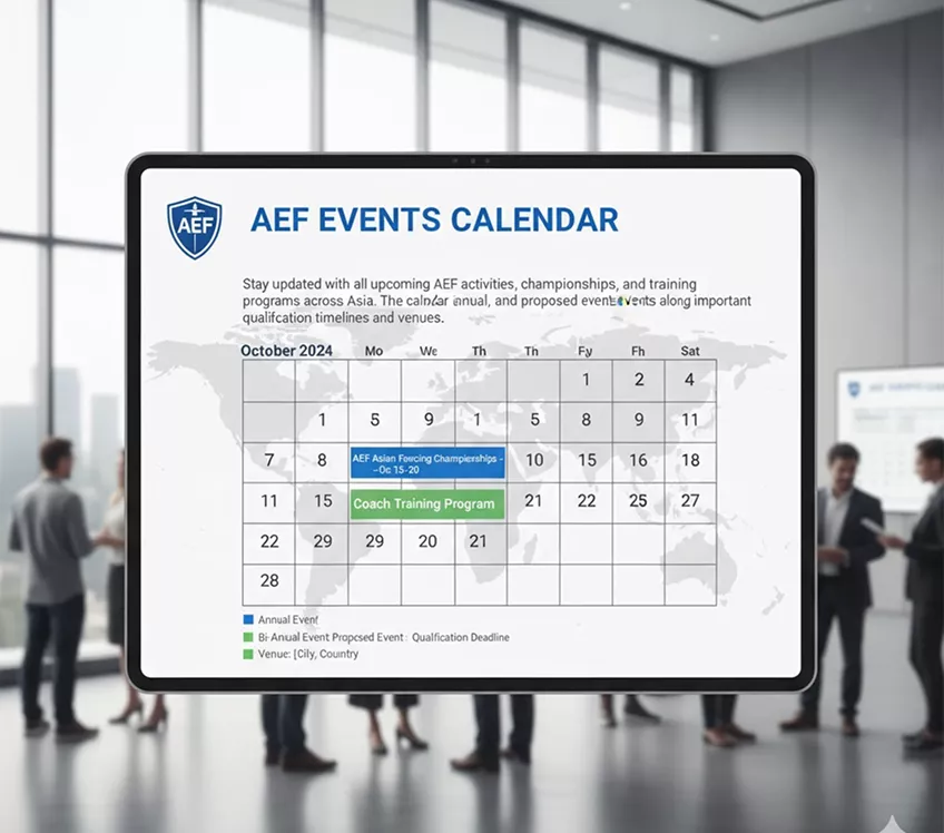 Stay updated with all upcoming AEF activities, championships, and training programs across Asia. The calendar includes annual, bi-annual, and proposed events along with important qualification timelines and venues.